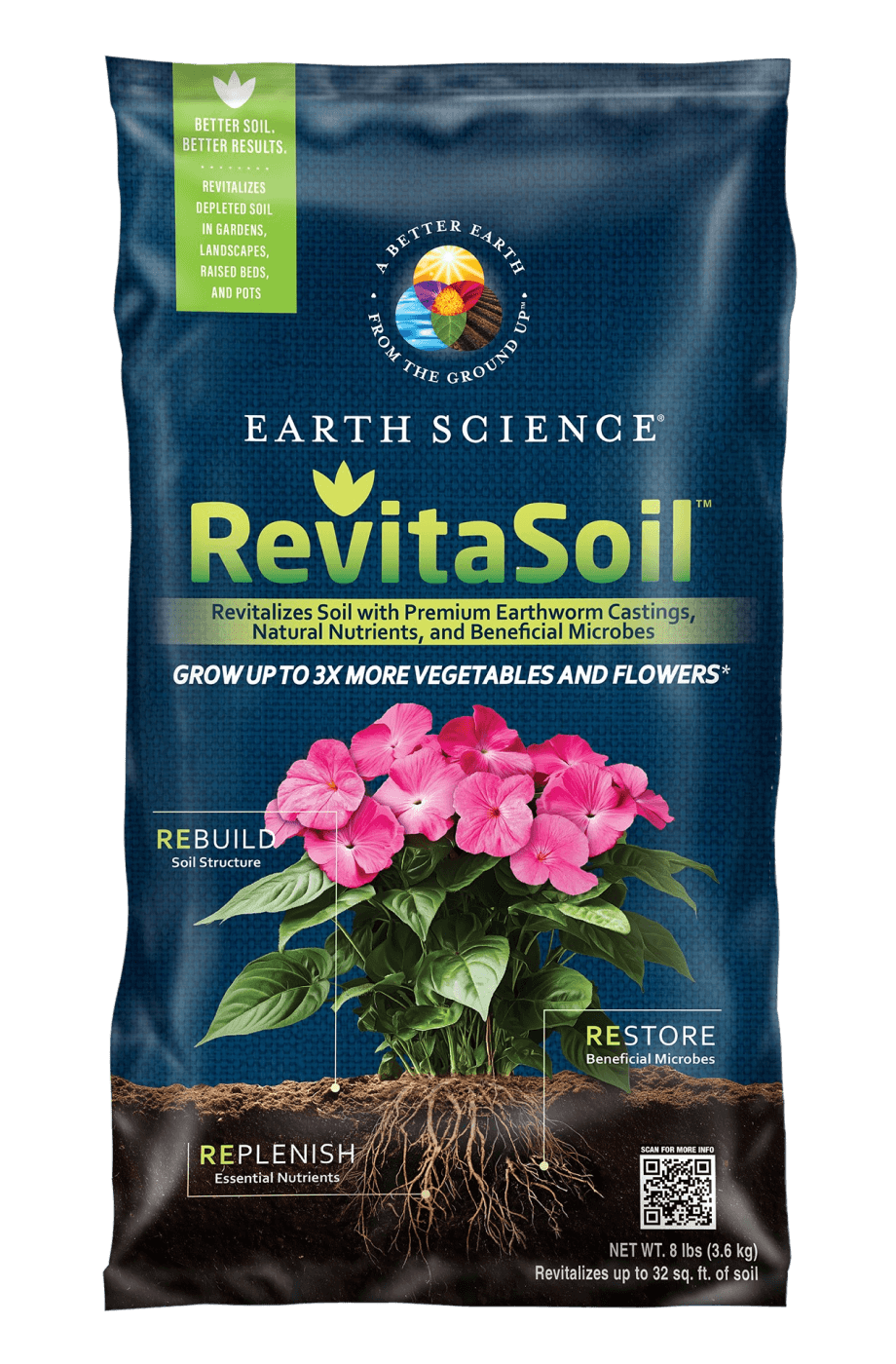 Even store-bought garden and potting soils lack important nutrients and can lose fertility after just one season. When soil quality is poor, plants require more water, more frequent applications of fertilizer, and are more susceptible to insects and disease. RevitaSoil™ features a proprietary, patent-pending technology to rebuild depleted soils with premium earthworm castings, natural nutrients, and soil-friendly beneficial microbes.